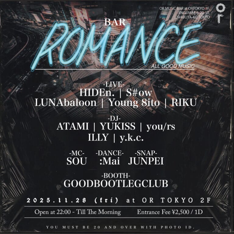 Live: HIDEn. S#ow LUNAballoon Young 8ito RIKU   DJ : ATAMI YUKISS you/rs ILLY y.k.c.   Dance: :Mai MC: SOU   Snap: JUNPEI Booth: GOODBOOTLEGCLUB   ⚠️上記期間のご入店は、終日20歳以上のお客様に限らせていただきます。ご来店の際は年齢確認のため、身分証明書をご提示いただきますようお願いいたします。 ⚠️店内での紙たばこの喫煙は一切禁止となりました。当店では、加熱式たばこ用の機器を店内でお貸ししております。ご希望のお客様は、お気軽にスタッフまでお声がけください。 ⚠️貸し切りイベントの開催をご希望のお客様は、『or』公式ホームページまたは店舗まで直接お問い合わせください。   ⚠️ Entry during this period will be limited to guests aged 20 and over at all times. Please be prepared to present a valid photo ID for age verification upon entry. ⚠️ Smoking of traditional (combustible) cigarettes is strictly prohibited inside the venue. We offer rental devices for heated tobacco products—please feel free to ask our staff if you would like to borrow one. ⚠️ For inquiries regarding private event bookings, please contact us through the official “or” website or directly at the venu