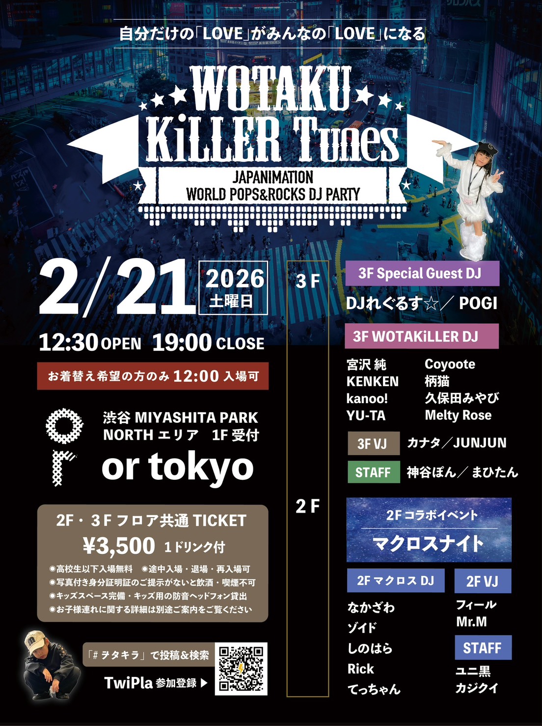 公式サイト   <2Fヲタキラフロア> GUEST DJ: DJれぐるす☆ POGI   レギュラーDJ: 宮沢純 kanoo! けんけん SMAAAASH!! YU-TA 柄猫 Coyoote   VJ: JUNJUN カナタ   STAFF : 神谷ぽん まひたん   <3F マクロスフロア> DJ : なかざわ ゾイド しのはら Rick てっちゃん   VJ: フィール Mr.M   STAFF: ユニ黒 カジクイ