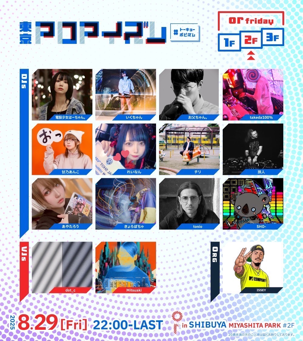 DJ : ISSEY / SHO- / takeda100% / tonio / 甘乃あんこ / あやたろう / いくちゃん /お父ちゃん。/ きょろぽちゃ/ チリ/ 旅人 / 電脳少女はーちゃん。 / れいなん