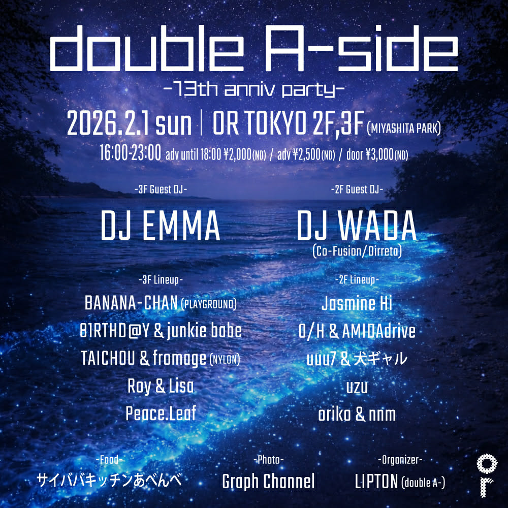 「double A-side」とは両A面、対極しつつも両A面(表裏一体)である音楽のジャンル・スタイルをお互いに認めあい、普段知らない人と繋がる楽しさや自分自身の今までにない可能性を見つけるパーティー。